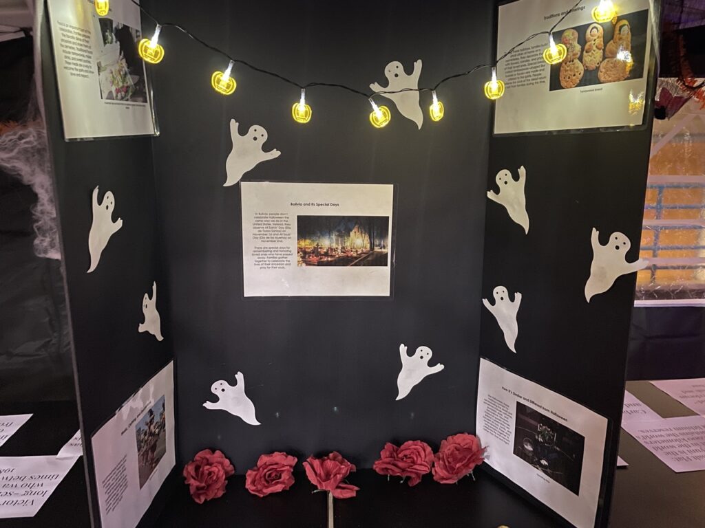 Each group selected a country, researched its celebration, and gathered information from a variety of sources. Students uncovered traditions connected to Día de los Muertos in Mexico, Obon in Japan, Gai Jatra in Nepal, Samhain in Ireland, and many more. As they worked, I saw their excitement build—not just about the final display, but about discovering similarities and differences across cultures. This project supported our Social Studies and Geography standards, while also strengthening ELA research and presentation skills.