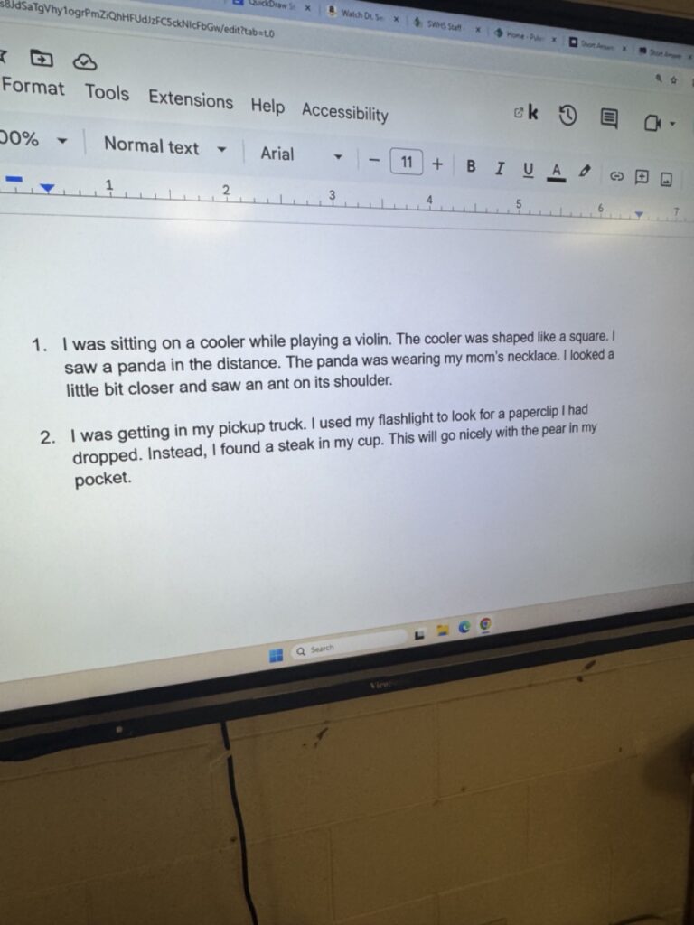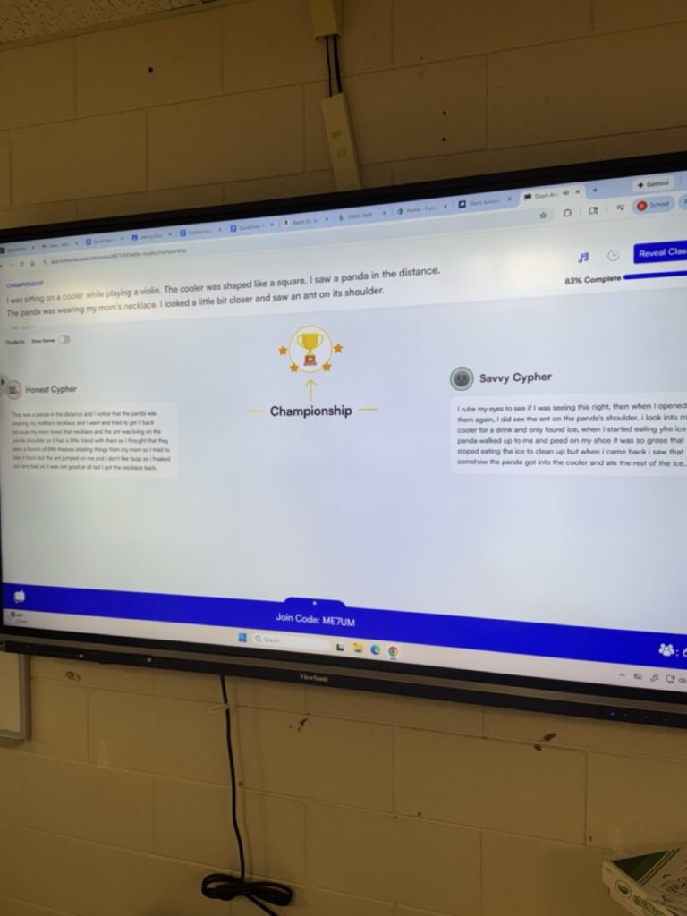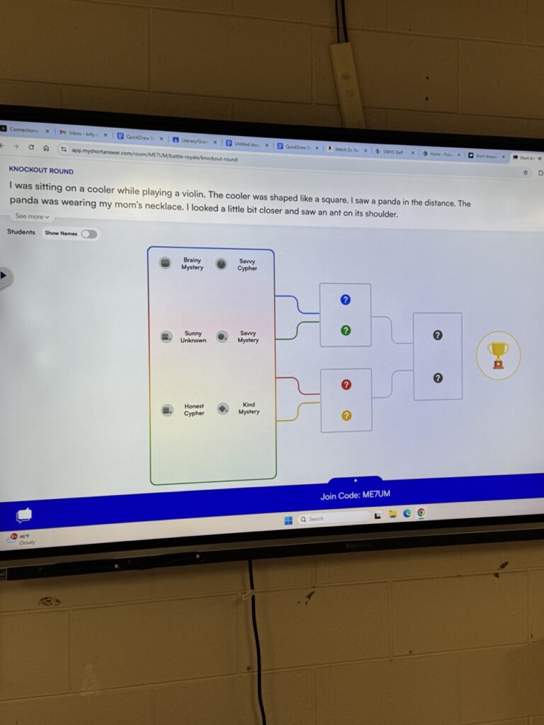 My classes just got finished preparing for and completing a mock On-Demand. In an attempt to make writing more fun and personable, we used a couple of technological tools to try to enhance their writing. First, we used the QuickDraw website. The students took turns drawing the six words it asked us to draw. We then used the words it gave us to create sentences using these words. We put these sentences together in a creative, fun paragraph. I took the classroom paragraph and entered it into a prompt on myshortanswer.com and the students competed to elaborate on our story and voted on what they thought was the best answer/story.