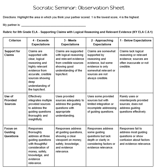 Using Magic School, which was first introduced to grant members during a Zoom meeting with Lisa Nydick, Mrs. Sexton created customized student rubrics after students worked together to developed the criteria by which their discussion would be assessed. The same platform was used to analyze student feedback collected through Google Forms to generate clear discussion norms, guided questions, and peer observation forms. Students completed these observation forms while actively participating in the discussion, allowing them to reflect on both their own contributions and those of their partners.