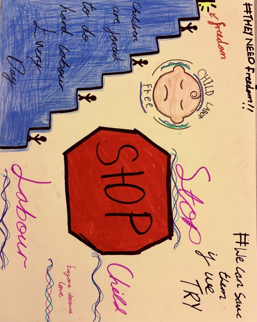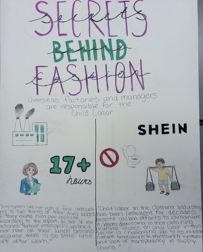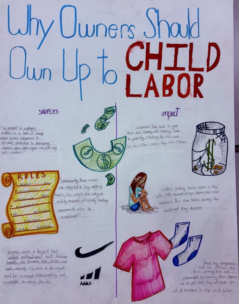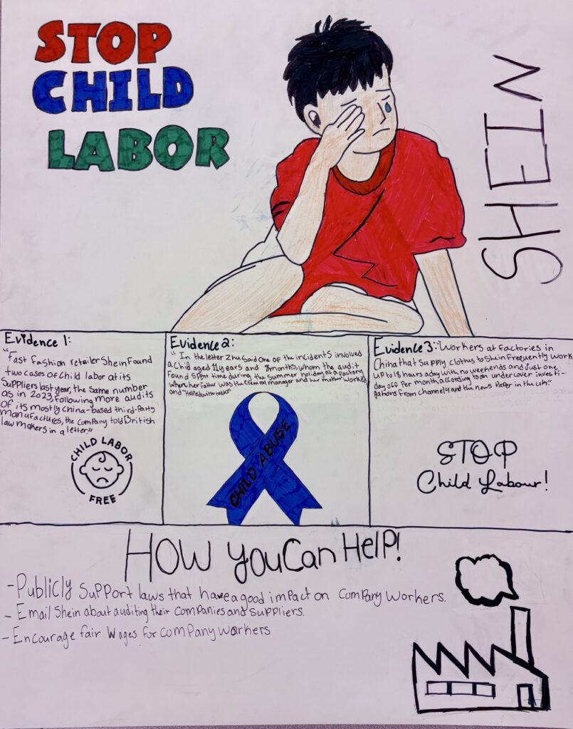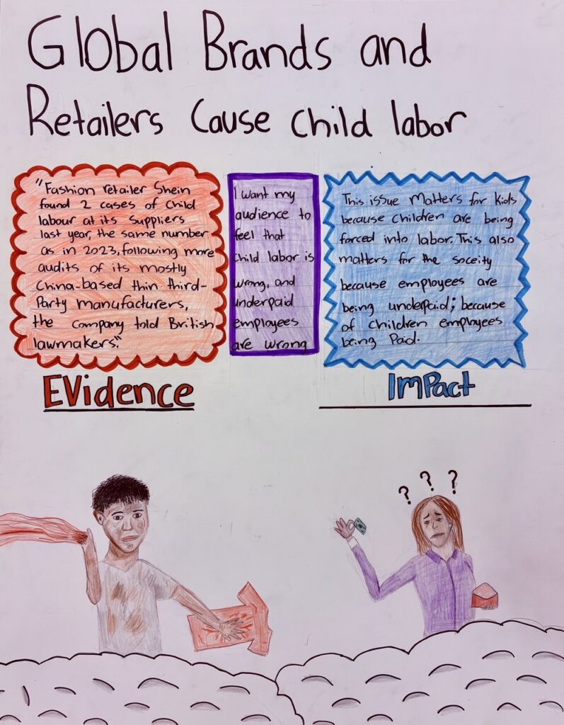 After analyzing articles and videos on fast-fashion supply chains, students identified and investigated potential modern stakeholders — factory owners, global brands, U.S. import companies, or consumers. Using evidence from their research, students composed claim-evidence-reasoning (C-E-R-T) essays that identified who they believed bore the greatest responsibility and proposed actionable solutions. Students then chose an authentic audience: some emailed company CEOs or U.S. senators, others wrote letters to the local newspaper or delivered persuasive speeches to their peers. The project culminated in a visual product, either a poster or infographic, designed individually or in small groups to advocate for change. These posters will be on display in the hallways of the school and during the school’s winter Curriculum Night, a family engagement event showcasing student work.
